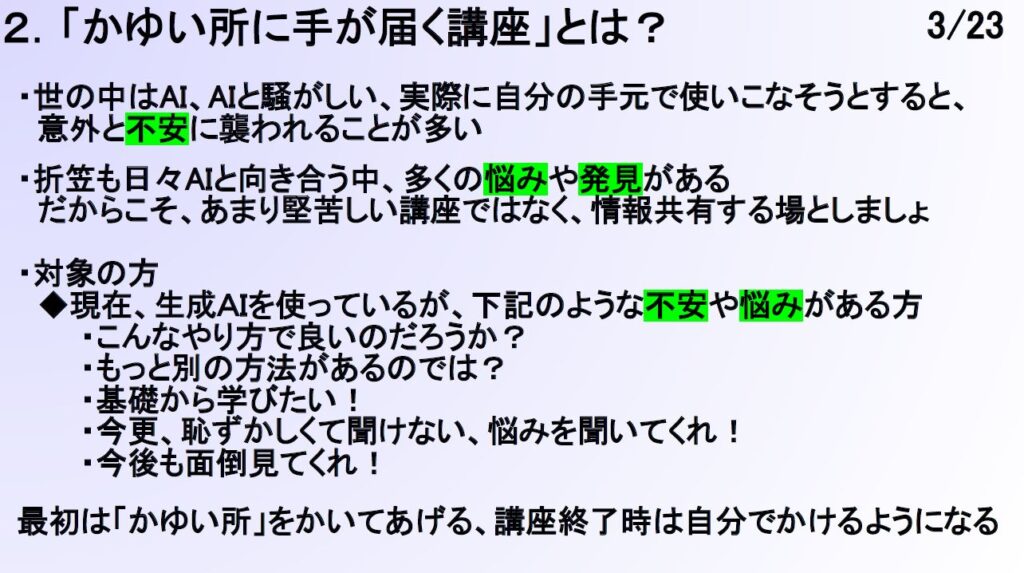 小生の講座、かゆいところに手が届く講座で冒頭このようなことを話します。