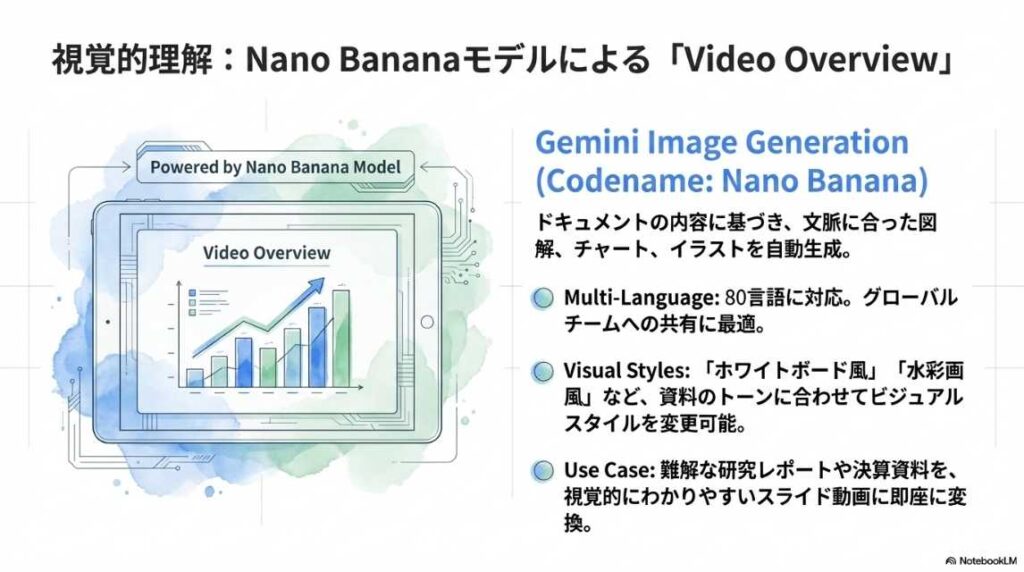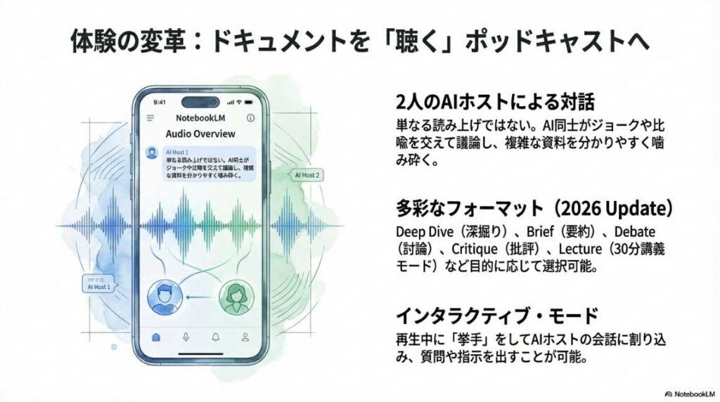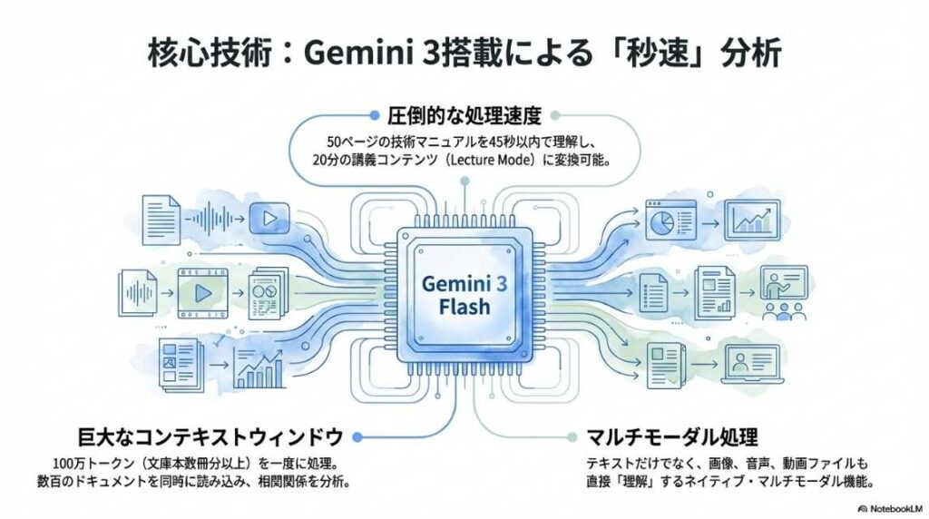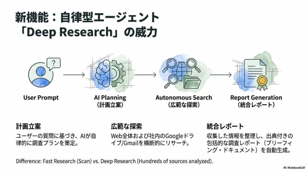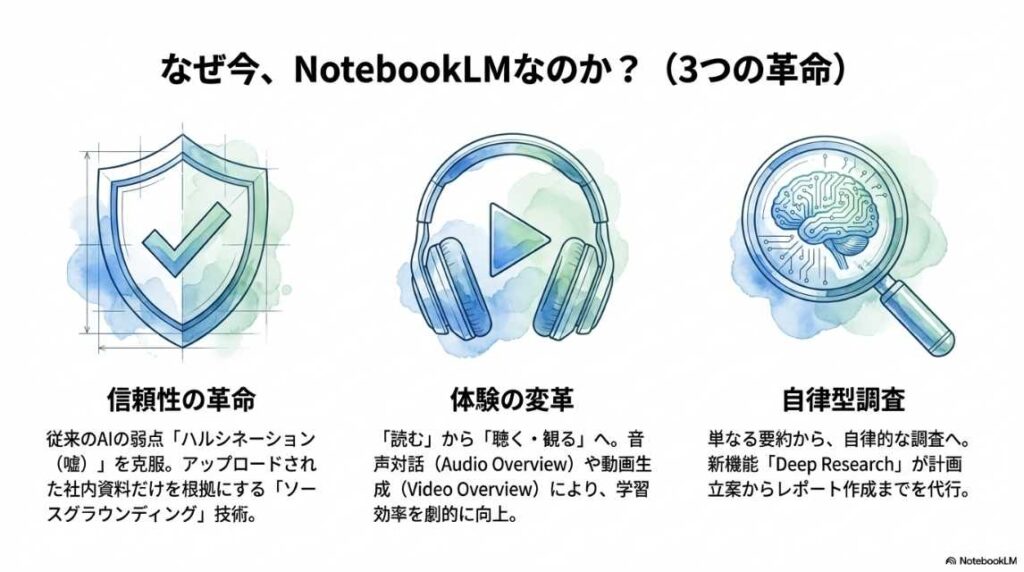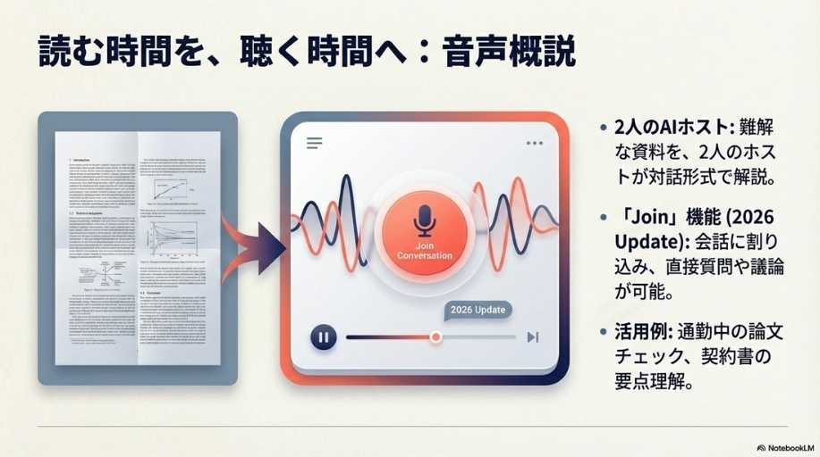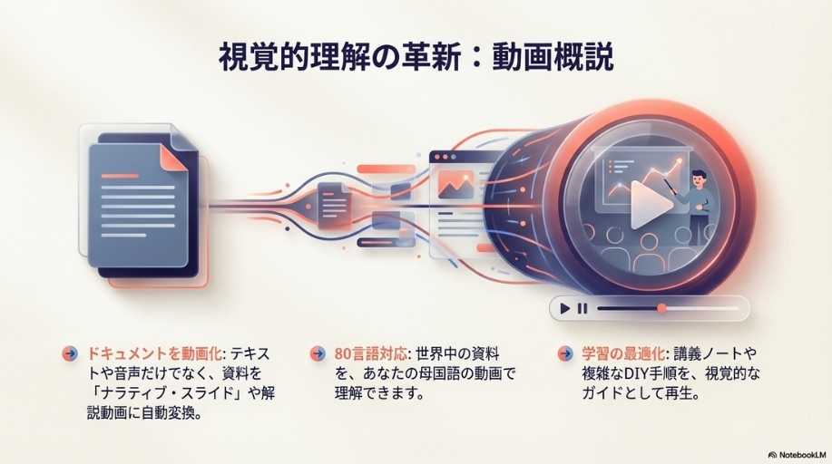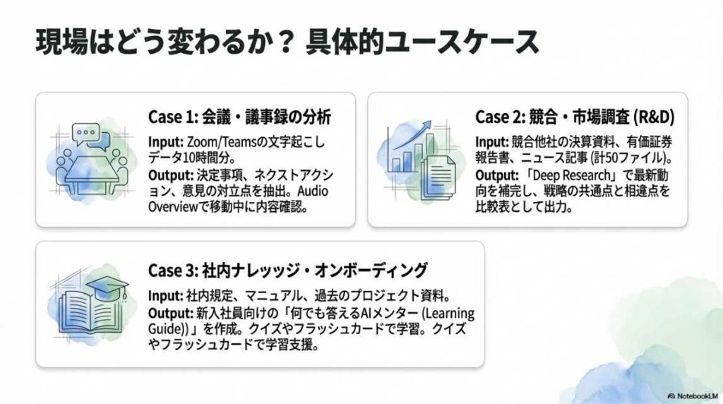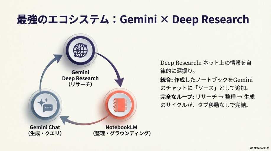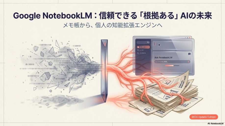 機能紹介: 情報を音声で理解する「Audio Overview」や、視覚的に整理する機能など、ツールの「What(何ができるか)」に焦点が当てられています。 これだけでも十分に実用的ですが、あくまで「情報の要約・整理」の域を出ていません。