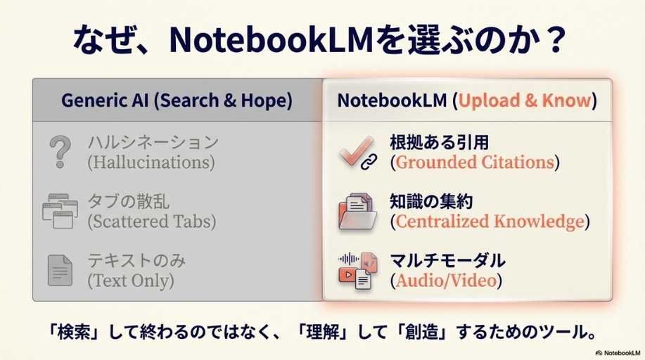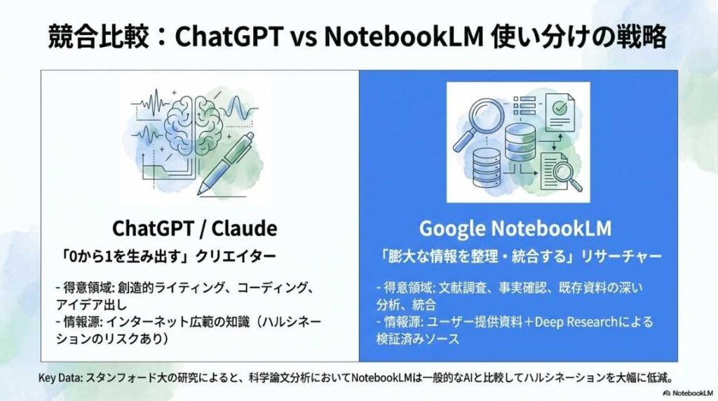 比較と差別化: 「ChatGPT vs NotebookLM」というスライドでは、ChatGPTを「0から1を生むクリエイター」、NotebookLMを「情報を統合するリサーチャー」と明確に役割分担し、使い分けの戦略まで提示してきました。