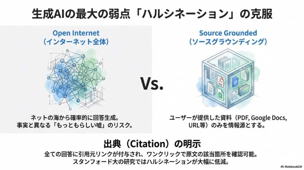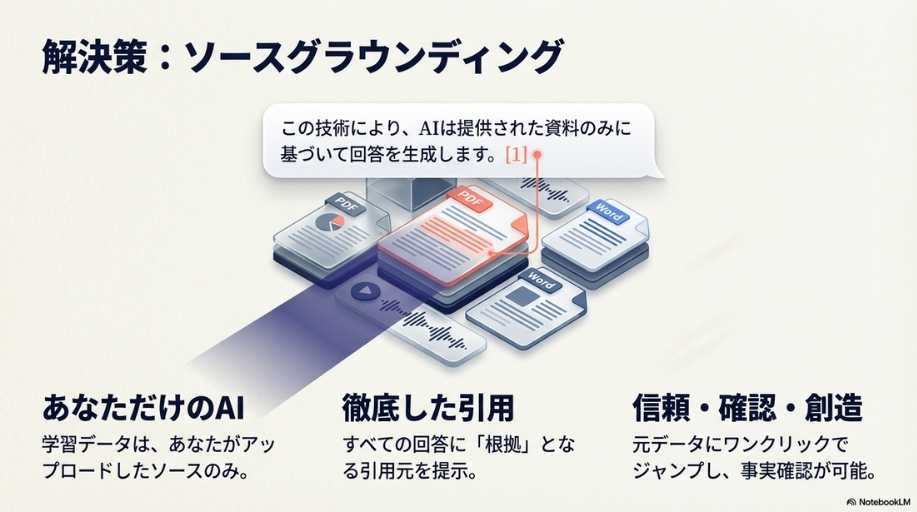 課題と解決: 従来のLLMが抱える「ハルシネーション(幻覚)」という課題に対し、「ソースグラウンディング」で信頼性を担保するという基本概念が丁寧に説明されています。