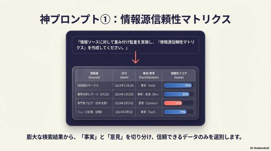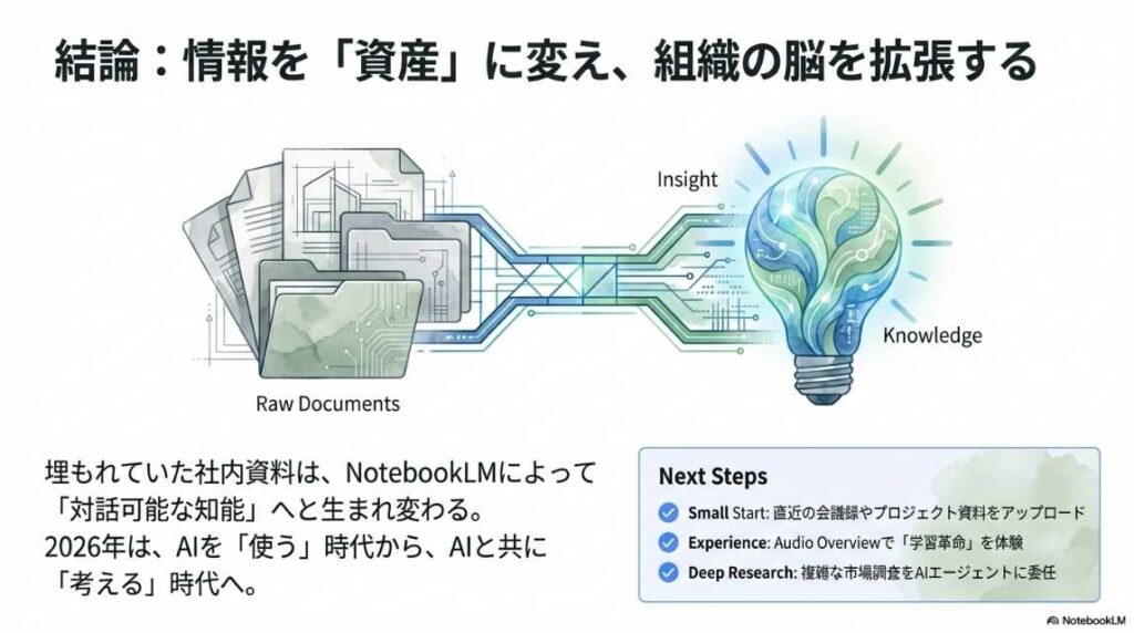 この違いから分かることは、NotebookLMは使い手の「問い」の深さに応じて、その知能レベルを自在に変身させるということです。