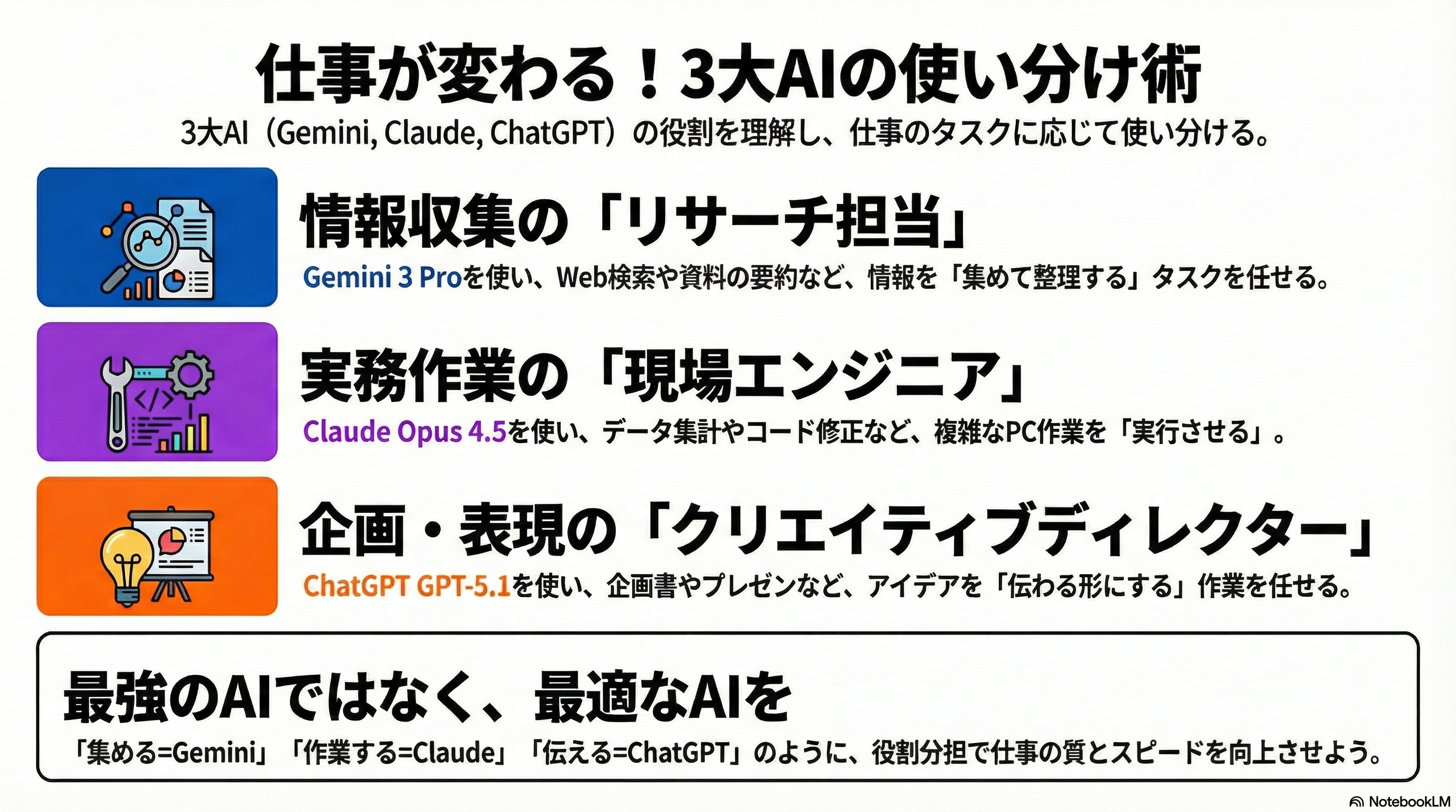 こんなふうに、「集める=Gemini」「作業する=Claude」「伝える=ChatGPT」と役割分担させると、仕事のスピードも質も一気に上がります。
