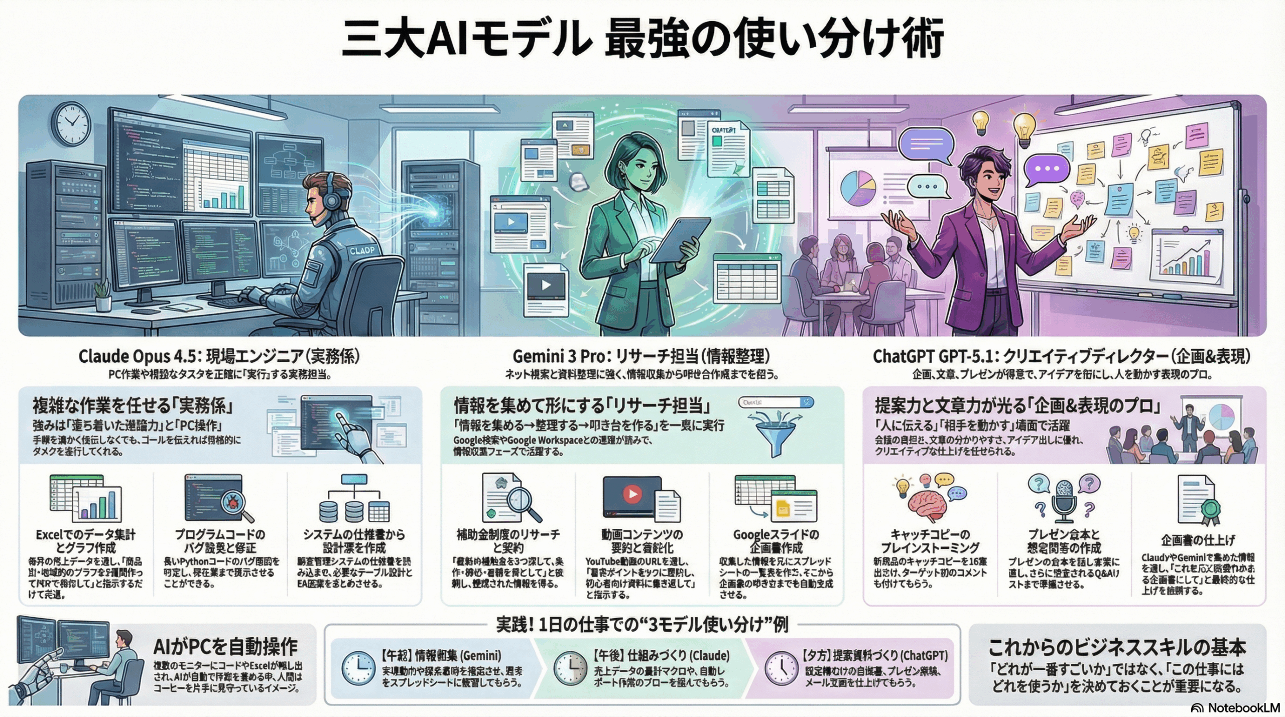 - Gemini 3 Pro:情報を集めて形にする「リサーチ担当」