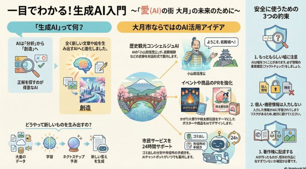 これだけで、AIが勝手に資料の中身を読んで、要点をまとめたスライドや、一目でわかる図(インフォグラフィック)を作ってくれます。しかも、渡した資料の内容「だけ」を使って作るので、AIが勝手な嘘をつく心配もありません。これは安心ですね。
