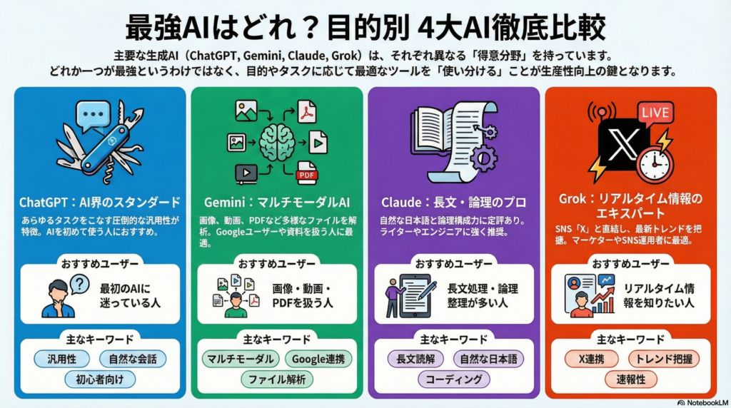ChatGPT、Gemini、Claude、Grok……次々と登場する魅力的なサービスを前に、「機能が多すぎて、結局どれを選べばいいのかわからない」と悩んでいる方も多いのではないでしょうか?