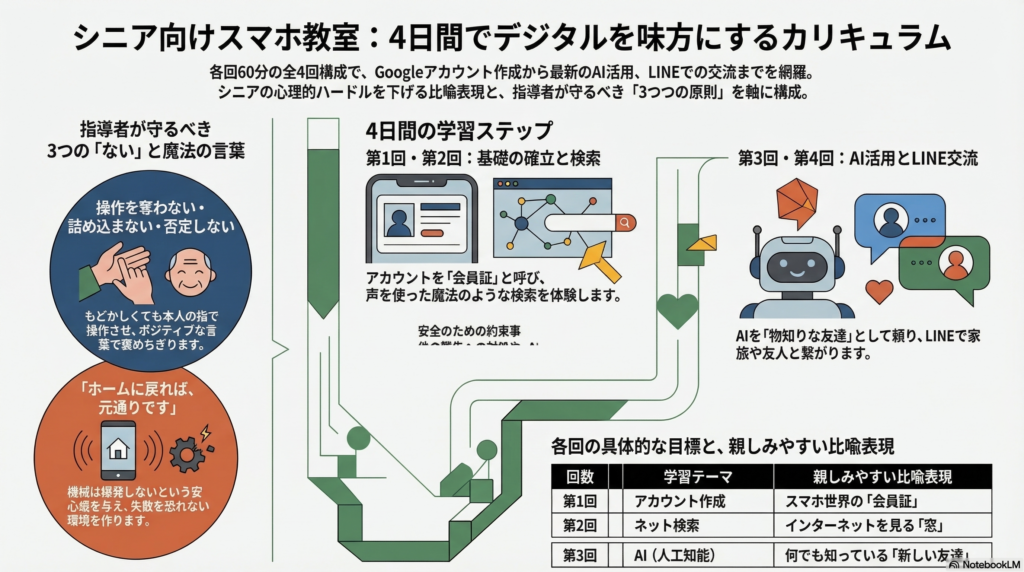 始める前の「例え話」で安心させる(10分): * Googleアカウントは「スマホ世界の会員証」であり、これがないと便利機能が使えないことを伝えます 。