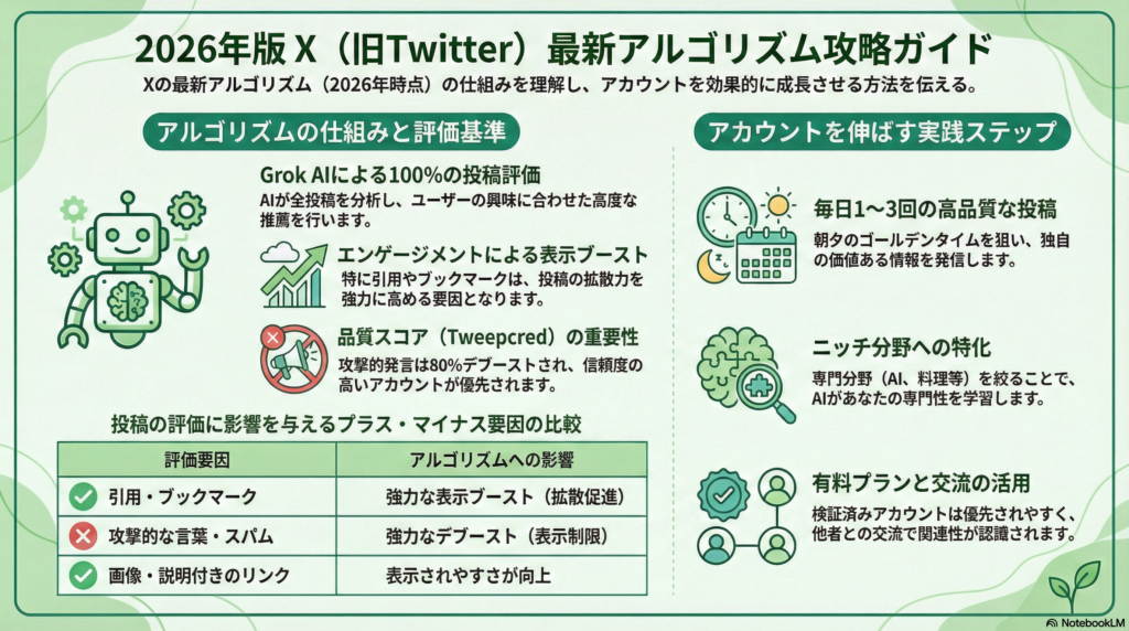 Xの最新アルゴリズム(2026年時点)は、ユーザーが見たいと思う投稿を優先的に表示する仕組みで、AI(特にGrokというAIモデル)を活用して進化しています。