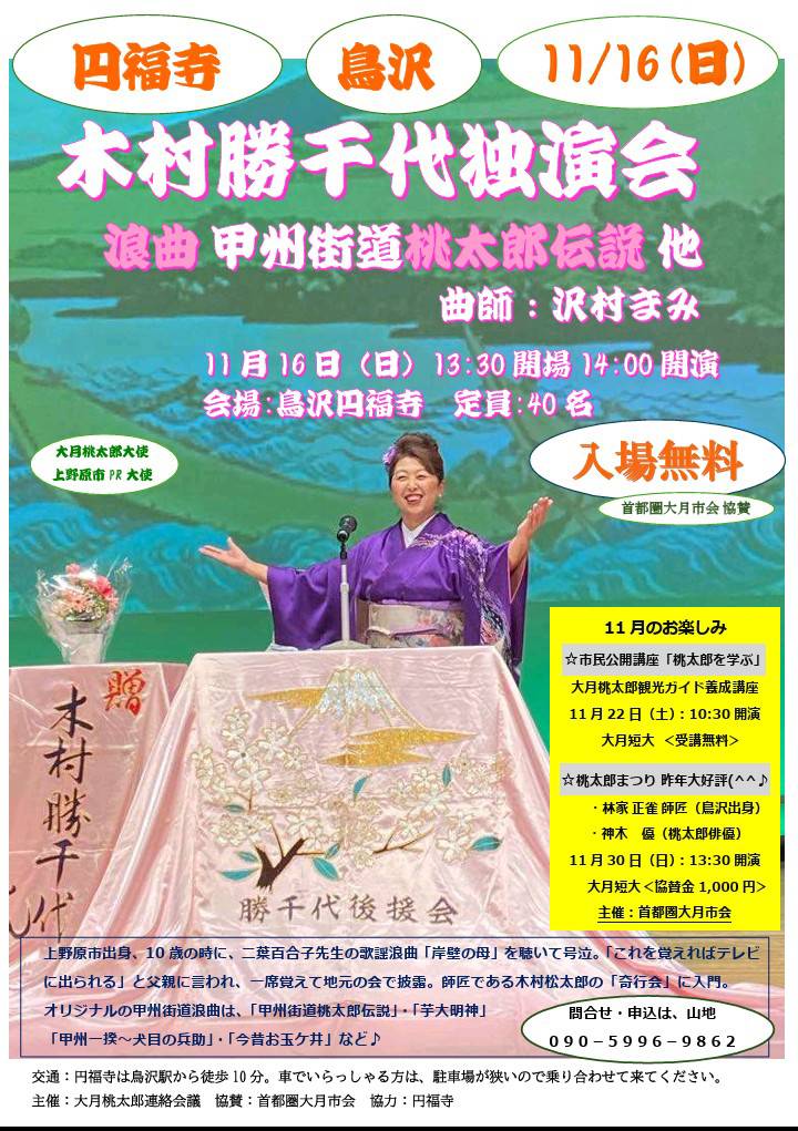 まずは浪曲の独演会です。 「甲州街道桃太郎伝説」と題した浪曲が披露されます。大月桃太郎大使でもある木村勝千代さんの公演です。