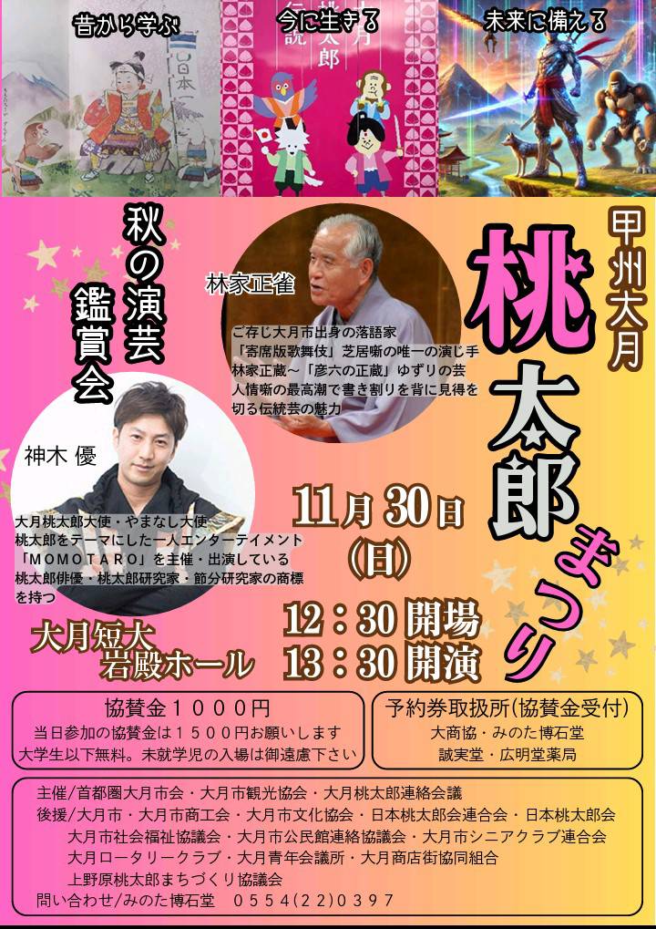 こちらは豪華ゲストが登場する「桃太郎まつり」です。 ご存じ大月市出身の落語家、林家正蔵師匠による寄席演芸と、同じく大月桃太郎大使の神木 優さんによる桃太郎をテーマにしたエンターテイメントが楽しめます。
