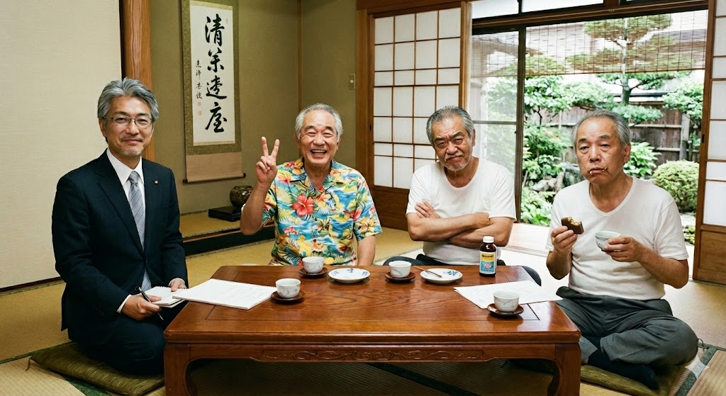 どうでもよい爺さん(以下、どうでも): 「……ん? ああ、わしか。わしは……そうじゃな、誰じゃったかな。まあ、人は『どうでもよい爺さん』と呼ぶ。今日の茶菓子は羊羹か? それとも饅頭か? そこが一番大事じゃな。議論? ああ、適当にやってくれ。雨が降らなきゃそれでいい」