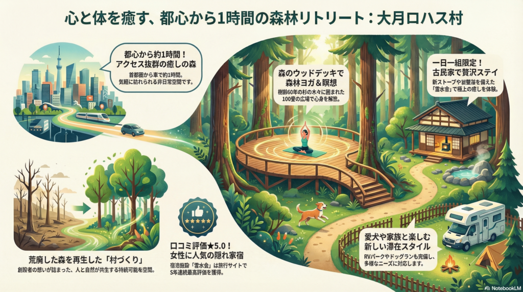 小生が特に感動したのは、単なる観光施設ではないという点です。 コンセプトは「自然との共生・調和」。 森の中には、樹齢60年の杉材で作られた100畳ものウッドデッキ「サンサーラ広場」があり、そこで森林ヨガや瞑想が行われます。 築50年の古民家を再生した宿泊施設「雲水舎」は、女性誌の口コミランキングで1位を獲得するほどの極上の癒やし空間。 さらには、最新の旅行スタイルに対応した「RVパーク」まで完備されており、キャンピングカーでの滞在も可能です。