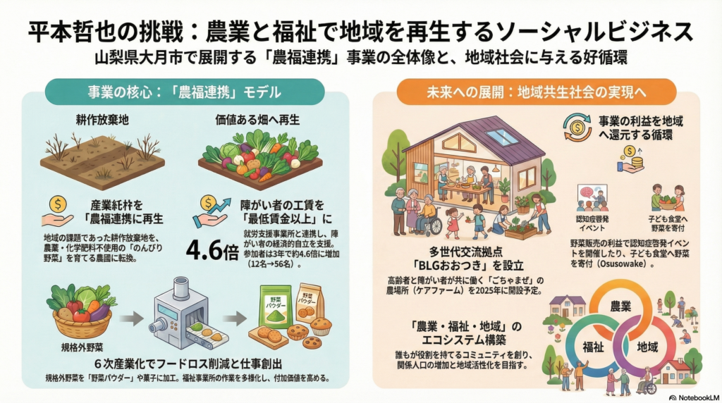 平本哲也さんは、山梨県大月市を拠点とする社会起業家であり、Goodwill Smile合同会社の代表を務められています。元ケアマネジャーとしての豊富な経験を活かし、2020年のUターン後に耕作放棄地を再生する「大月コノファーム」を設立されました。「農福連携」を軸に、障がい者への最低賃金以上の工賃支払いや、6次産業化を実現されている、まさに有言実行のリーダーです。さらに、2025年には多世代交流拠点「BLGおおつき」の開設を予定されており、誰もが役割を持ち、安心して暮らせる「ケアファーム」構想の実現に情熱を注いでおられます。