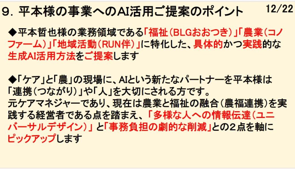 今回、小生が平本さんの事業(福祉・農業・地域活動)に特化してご提案したAI活用術、その名も『平本哲也様の業務領域に特化した、具体的かつ実践的な生成AI活用方法』です。
