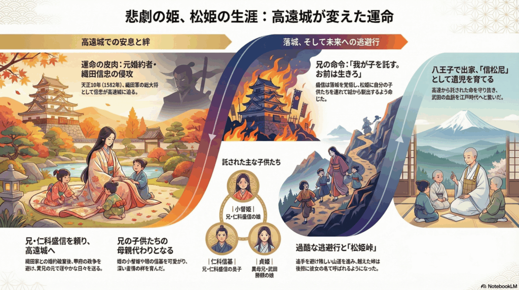 現地に立ち、「伊那の浮城」と称される高遠城の、あの断崖を見下ろした時、予習した知識が鮮烈な「感情」となって押し寄せてきました。 ここは単なる軍事拠点ではありませんでした。松姫様にとって、最愛の兄・仁科盛信公に守られた、安息の聖域だったのです。しかし、運命とはなんと残酷なことか。その聖域を攻め滅ぼそうと迫り来る総大将は、かつて将来を誓い合った許嫁、織田信忠その人でした。