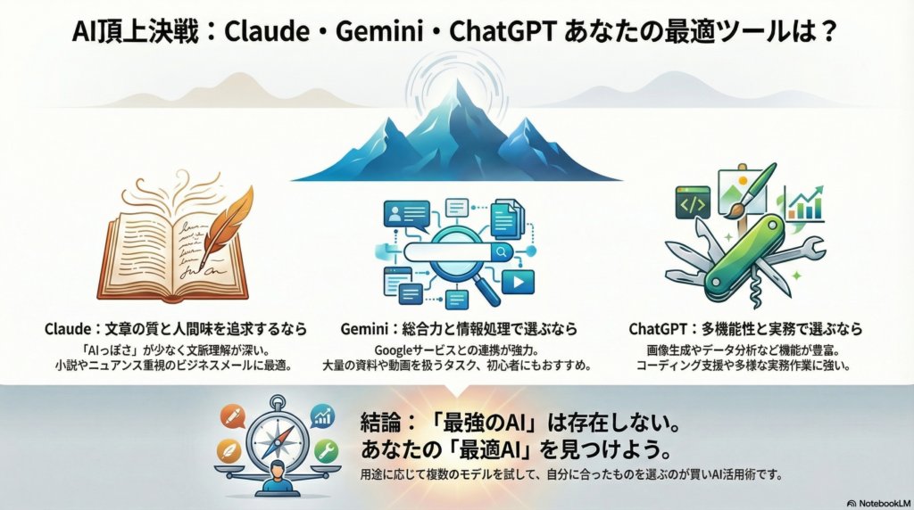 初心者はGeminiのアクセシビリティから始めるのが合理的ですが、文章重視ならClaude、汎用実務ならGPT-5.2を加えると良いでしょう。