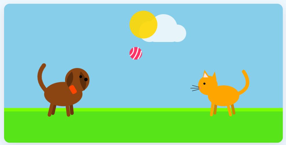 「ボールで遊ぶ猫と犬。SVGアニメーションで作成して」
