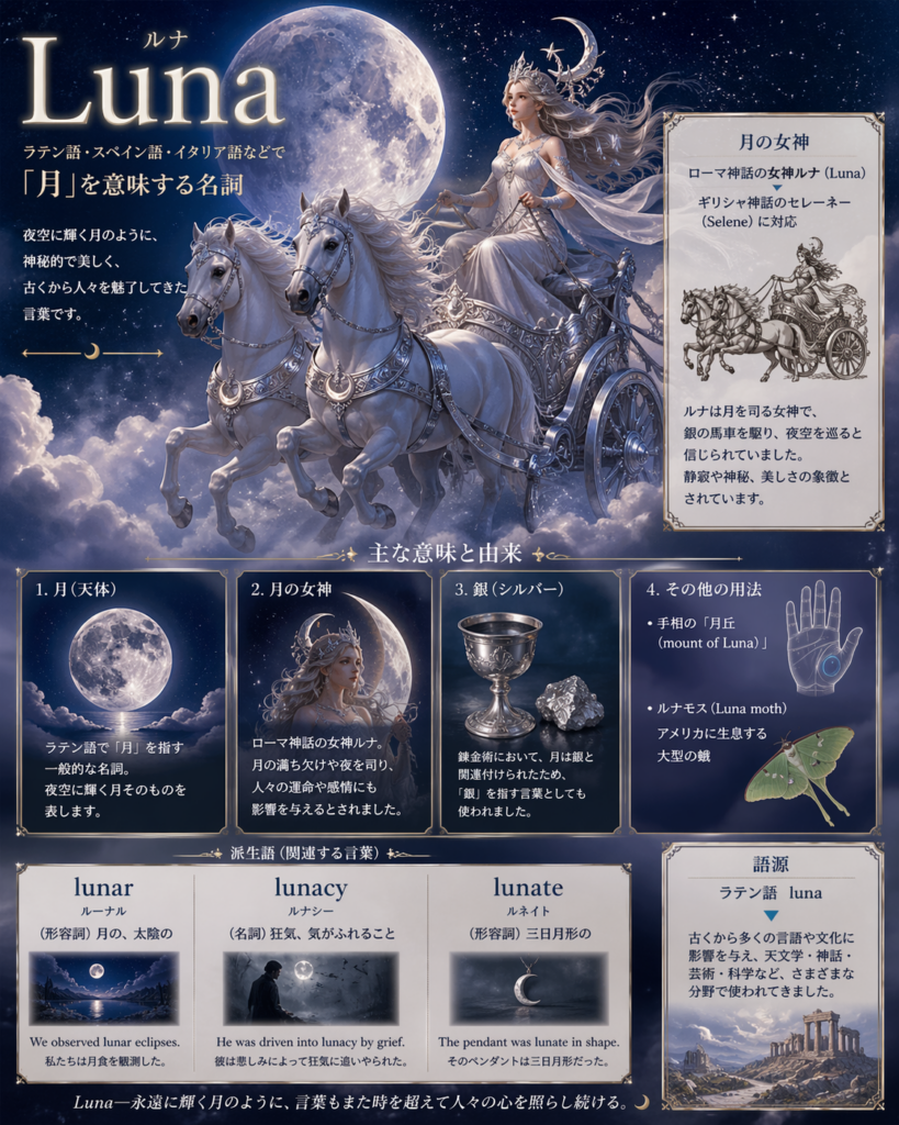 ルナ(Luna)は、ラテン語やスペイン語、イタリア語などで「月」を意味する名詞です。ローマ神話における月の女神の名前でもあり、銀の馬車を駆る姿で描かれます。月に関連する形容詞は「lunar(月の、太陰の)」となります。