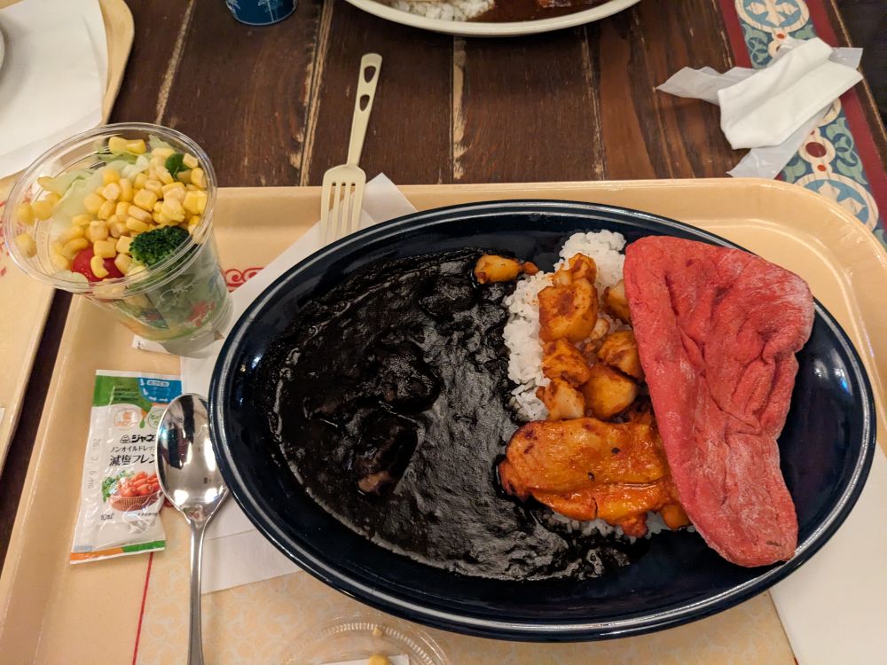 昼飯はアラジンビーフカレー辛口&ライス、ナン、鳥肉フライ、ポテトフライ カップサラダ 生ビール←途中からウイスキー注入