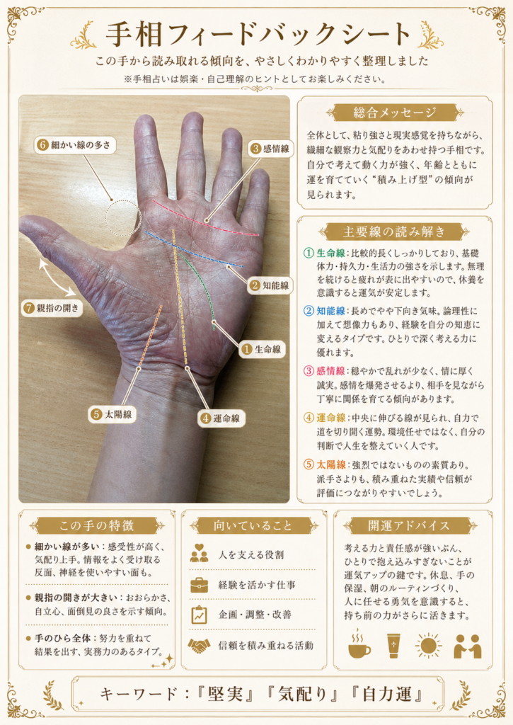 自分の手の写真をAIに読み込ませ、手相フィードバックシートを作ってみました。もちろん手相占いは娯楽であり、自己理解のヒントです。人生を断定するものではありません。