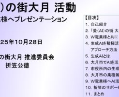 今週の火曜日の夕方、小生が推進しております「愛(AI)の街大月」活動の一環として、市内の老舗企業であるW電業様にてプレゼンテーションをさせていただく機会を得ました。 ご紹介役の友人(議員)にも同行いただき、訪れたW電業様 […]