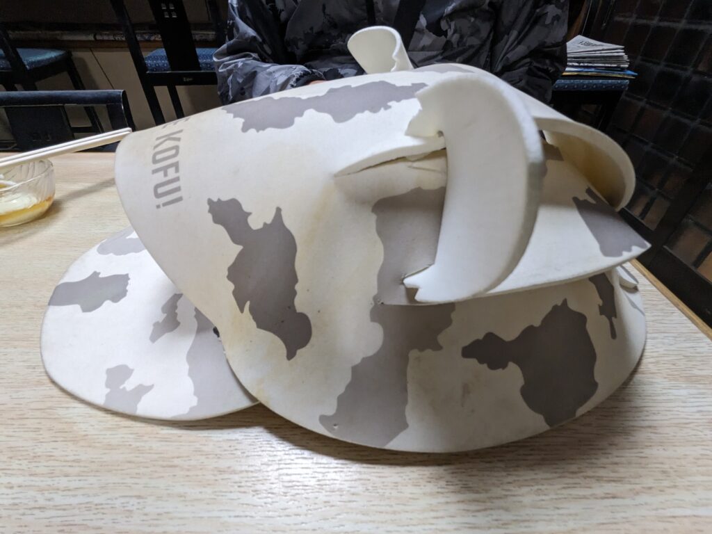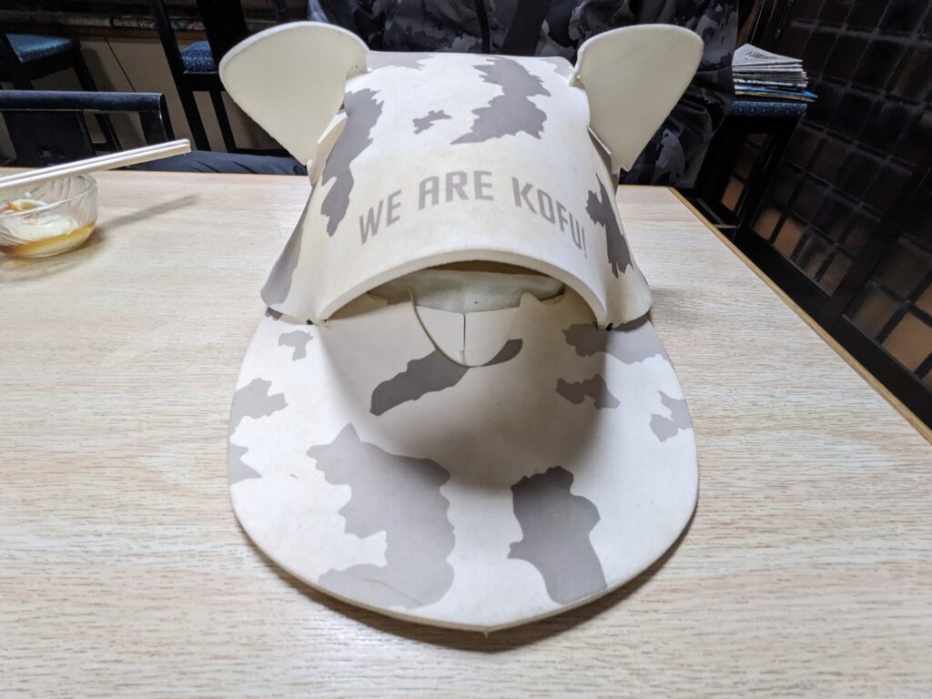 製作手順: ①グレーで不規則な牛柄模様と「WE ARE KOFU!」文字を描画。②クラウンに耳用スリットを入れ、耳のタブを差し込み固定。③クラウンを円筒形に成形し、端部をタブで接続。④つば中央穴の周囲に8-12箇所切り込みを入れる。⑤クラウン下部のタブを切り込みに差し込み、裏側で放射状に折り曲げて固定。⑥全体バランスを調整し、必要に応じてテープで補強。