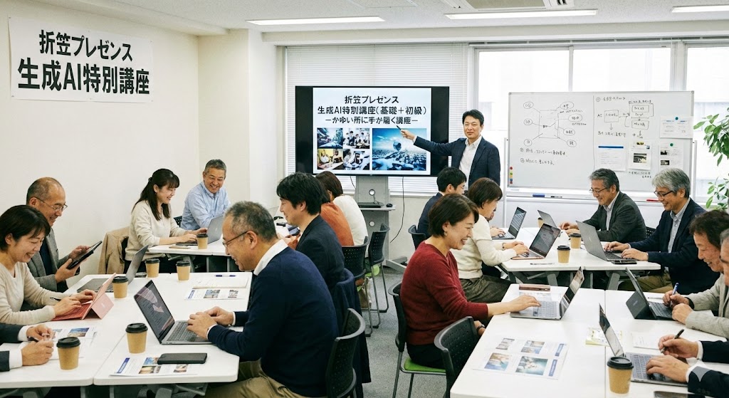 かねてより準備を進めてまいりましたが、この度、ついに「折笠プレゼンス 生成AI特別講座(基礎+初級)」を開講する運びとなりました 。